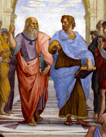 Centre de la fresque L’école d’Athènes, de Raphaël (1509-1510). A gauche, Platon indique le ciel, le monde des idées. A droite, Aristote désigne le sol, la matière.