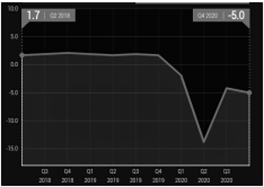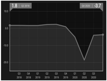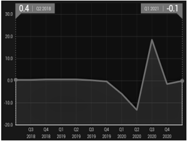 « Au premier trimestre 2021, le produit intérieur brut (PIB) en volume baisse légèrement : – 0,1 % après – 1,5 % au quatrième trimestre 2020. Il s’établit à 4,7 % en deçà de son niveau du quatrième trimestre 2019, dernier trimestre avant la crise sanitaire. »