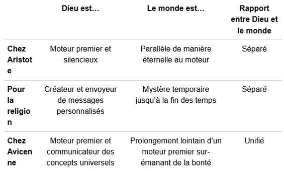 Avicenne modifie la définition de Dieu que l’on trouve chez Aristote. Chez ce dernier en effet, Dieu n’est que le « moteur premier ». Il est simplement le moteur lui-même non mu, car il fallait bien un démarreur pour activer le système de causes et de conséquences caractérisant le monde.