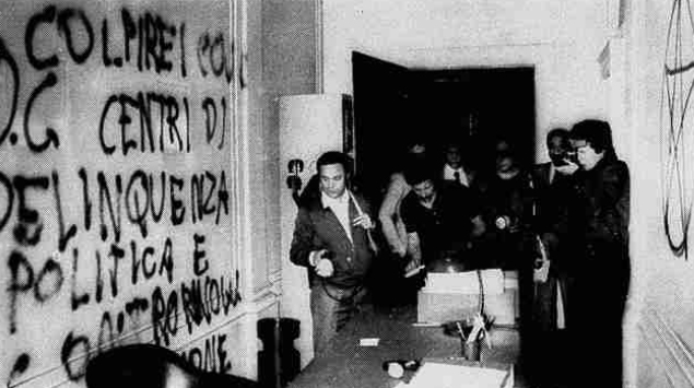 Une unité armée des Brigades Rouges a recherché et éliminé un nid démocrate-chrétien situé au 15 de la rue Monte de Pieta : le siège d’Initiative Démocratique, un groupe de provocateurs anti- communistes mieux connu sous le nom de « bande à De Carolis ».