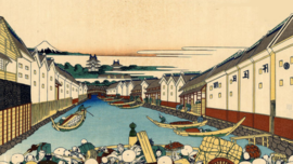 Ushibori dans la province de Hitachi, la vingtième estampe des Trente-six vues du mont Fuji, est d’une grande pertinence en tant qu’oeuvre exposant le réalisme mis en perspective. C’est une présentation efficace. On retrouve ici la capacité de Hokusai à partir d’un « poids » pour obtenir une perspective qui s’élance, tout en profitant d’une […]