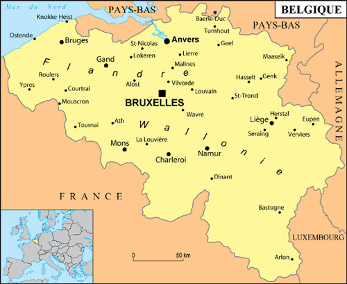 Cette carte de Belgique présente les neuf provinces qui composent le pays (ces provinces seront bientôt au nombre de dix, puisque le Brabant doit être divisé en un Brabant wallon et un Brabant flamand [voir la carte suivante]). Elle ne rend cependant pas compte des importantes réalités régionales et linguistiques. Le pays est divisé en trois régions : la Flandre (comprenant les provinces des deux Flandres, d’Anvers, du Limbourg et la partie septentrionale du Brabant), la Wallonie (comprenant les provinces du Hainaut, du Luxembourg, de Liège, de Namur et la partie méridionale du Brabant) et la région bilingue de Bruxelles ( capitale ). Aux institutions nationales, provinciales et régionales ( ces dernières étant autonomes depuis 1977 ) s’ajoutent les institutions « communautaires » : communautés flamande, française ( Wallonie et Bruxelles ) et germanophone ( les cantons rédimés d’Eupen et Malmédy gagnés sur l’Allemagne après la première guerre mondiale ). L’ensemble débouchant sur un infernal imbroglio institutionnel. Le processus actuel de fédéralisation de l’État et la plus grande autonomie accordée ainsi aux régions et communautés ont quelque peu apaisé les querelles linguistiques ( Flamands / Wallons ) qui ont lamentablement émaillé la vie politique belge durant de longues années. L’ancien clivage entre une Flandre rurale et catholique et une Wallonie socialiste et industrielle est dépassé depuis bien longtemps, tant du fait de l’industrialisation de la Flandre ( pétrochimie à Anvers, etc. ) que du déclin des secteurs traditionnels implantés en Wallonie ( charbon, sidérurgie, métallurgie, etc ). Véritable « Koweit charbonnier », la Wallonie permit à la Belgique de devenir au XIXe siècle le deuxième pays industriel et minier du monde après l’Angleterre. Le pays était alors deux fois plus équipé en machines à vapeur que l’Allemagne et cinq fois plus que la France.
