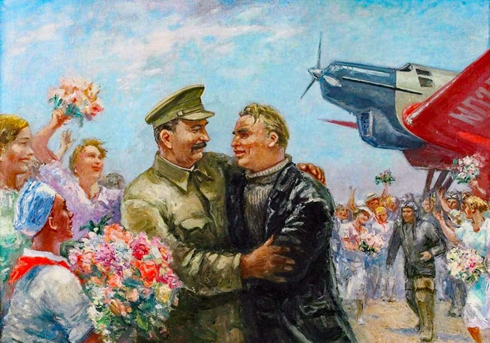 Tableau des années 1930 représentant le camarade Staline félicitant le pilote d’essai soviétique le plus célèbre de l’époque, Valery Pavlovich Chkalov.