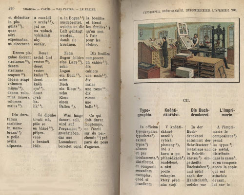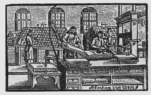 L’imprimeur est assorti de lettres de métal en grand nombre et de toutes sortes, arrangées (partagées) en une caisse par cassetins [5]. Le compositeur [1] les en tire l’une après l’autre, et compose les mots avec le poinçon selon la copie (le manuscript) qu’il tient fichée devant soi à un mordant [2] (avec le composteur [3]) jusqu’à ce qu’une ligne (ou un verset) soit achevée; qu’il met (agence, ajuste) dans la forme [4] (la galée), successivement jusqu’à ce qu’il puisse en faire une page [36]; qu’il couche encore une fois (derechef) sur le composoir [7], et il l’y serre avec des plaques de fer [8], par le moyen de la vis [9] et des barreaux afin que les lettres demeurent bien en-semble, unies, et il la met sous la presse [10]. En suite de quoi, l’imprimeur mouille (humecte) les lettres avec l’encre à imprimer, se servant de balles de cuir [11], à présent de cylindres; il y met par-dessus des feuilles de papier qu’il couvre d’un châssis [12], et après qu’il les a couchées dans le coffret sous la presse [13], il leur fait emboire les lettres, en les pressurant du varrinet (du barreau) [15].