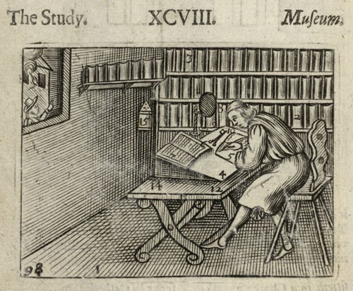 Le cabinet (1) est l’endroit où l’étudiant (2) est assis seul à l’écart des hommes; il s’y adonne aux études. Il lit des livres (3); avec une plume (4), il note sur un cahier (5) des morceaux choisis ou les marque sur le livre d’un trait ou d’une astérisque en marge. Quand il travaille tard, il allume une bougie (8) posée sur un chandelier (9). Il mouche la bougie avec une pincette (10). Devant la falmme, il place un écran vert (11) pour ne pas être ébloui. Quand la nuit vient, il utilise une lanterne (15) ou une torche (16).