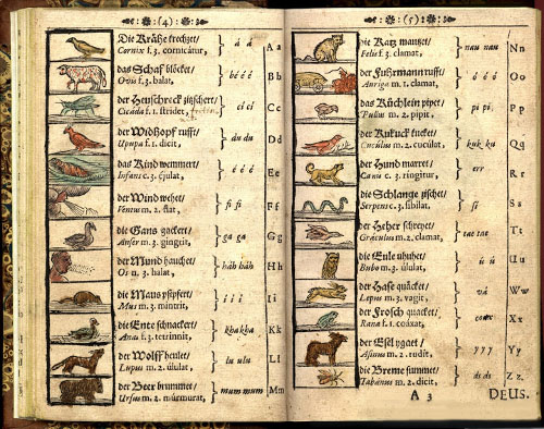 [Voici des exemples d’images et de texte qu’on trouve dans Orbis sensualium pictus.]
