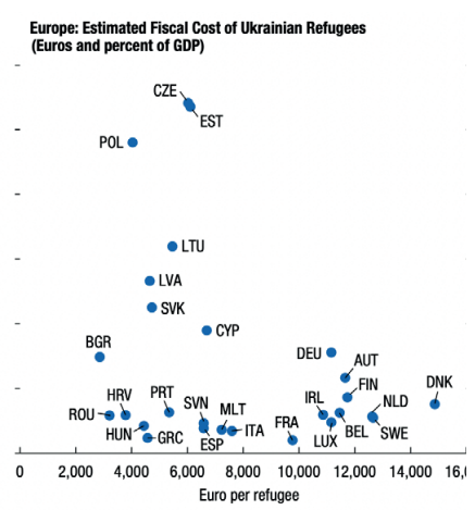 On notera par ailleurs que l’émigration ukrainienne, de 4,2 millions de personnes, a également son prix. Ce dernier est énorme pour quelques pays en particulier ; on parle là d’un PIB littéralement touché par autour d’un point pour la République tchèque, l’Estonie et la Pologne, ainsi qu’à hauteur d’un demi-point pour la Lituanie, la Lettonie, la Slovaquie. Ces pays sont culturellement proches de l’Ukraine ou bien on peut y parler russe, mais surtout leurs régimes comptent profiter de cette immigration pour renforcer la dynamique militariste, littéralement fanatique, visant la Russie.