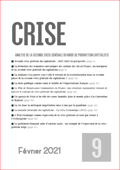Ce neuvième numéro de Crise, au mois de janvier 2021, est publié alors que la seconde crise générale du capitalisme rentre dans une nouvelle étape, celle de la restructuration. Le capitalisme a réussi à utiliser tous les moyens disponibles pour apparemment éteindre le feu de la crise économique ouverte par la pandémie. En réalité, il n’a fait que repousser les échéances, alors que de toutes façons la pandémie est issue d’une contradiction villes-campagnes qui ne cesse de s’approfondir.