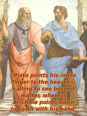 In the famous painting “The School of Athens” by the Renaissance painter Raphael, we can see Plato and Aristotle as the central figures: Plato points his index finger to the heavens, calling to see beyond matter, whereas Aristotle points down to earth with his hand.