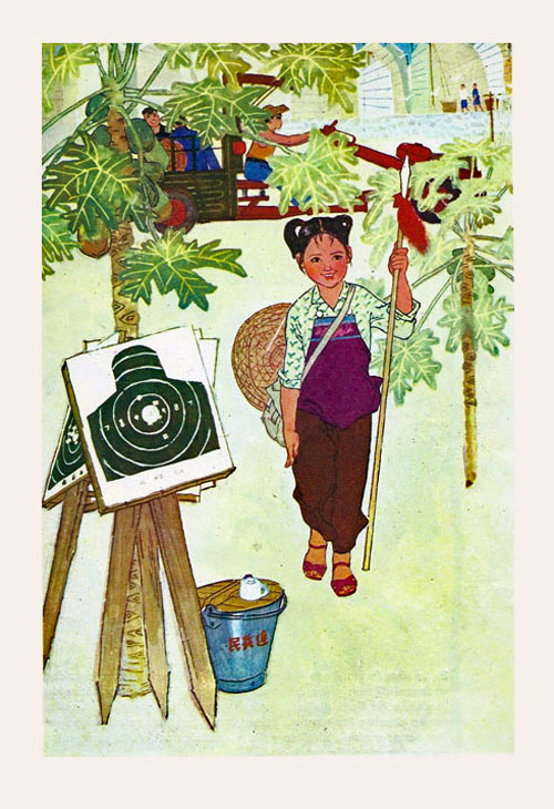 1 Un beau matin, alors que les miliciens de la brigade de production de Tsaohsi font l’exercice sur la plage, une lance sort brusquement d’un bosquet non loin de là. La très jeune fille qui la tient en main vient ici faire ses exercices militaires à l’exemple des miliciens, ses aînés. Comme elle a envie de devenir, elle aussi, une milicienne au service de la défense de la Patrie ! Cette fillette du nom de Hai-houa (Fleur de la Mer) est membre de la Petite Garde rouge de l’école primaire Etoile rouge.