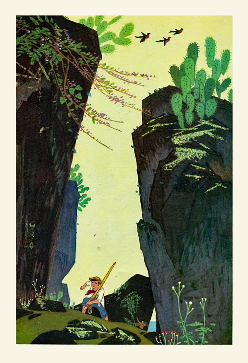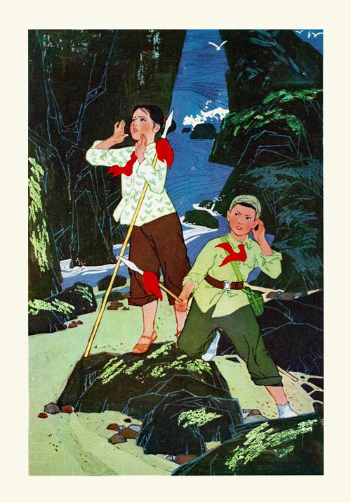 10 Au même moment, Hai-houa et Tche-hai cherchent leur camarade Siao-po dans le village. Comme ils ne le trouvent nulle part, ils se rendent dans la montagne où ils l’appellent à grands cris. Finalement près de la Fosse aux Loutres, ils entendent Siao-po leur répondre.