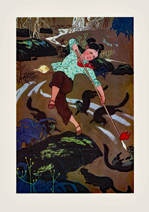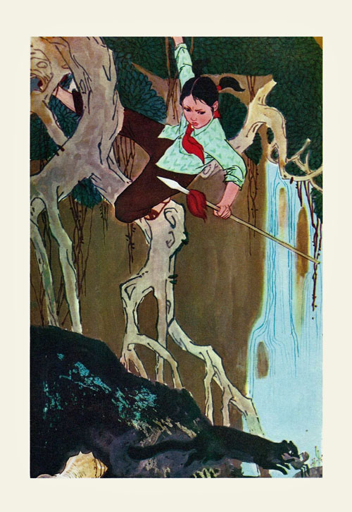 31 Lorsque ce vieux serpent s’approche d’eux, Hai-houa sort du bois. Elle lui coupe le chemin et lui demande où elle va. La vieille supplie instamment : « Grâce, grâce ! Laisse-moi partir ! » − « Non ! dit Hai-houa. Vous autres avez fait mourir tant de pêcheurs pauvres dans l’ancienne société ! Et toi qui aujourd’hui encore poursuis tes activités contre-révolutionnaires ! Inutile d’essayer de t’enfuir par la mer ! »
