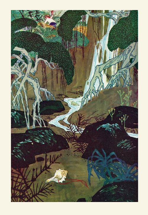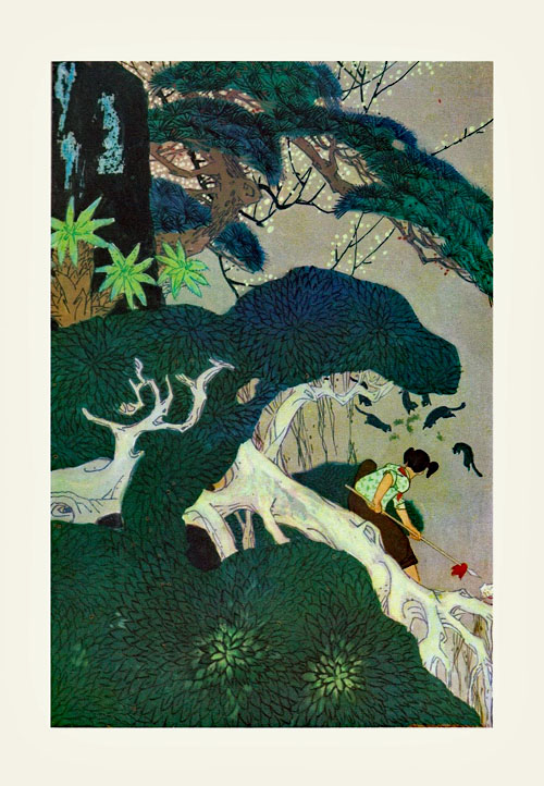 9 Sans vraiment croire à ses paroles, Siao-po ne peut s’empêcher de suivre le sentier indiqué. Il trouve bien le pin noueux, mais pas une branche à l’écorce rouge, ni sur l’arbre ni dans les environs. Il se rend compte qu’il s’est laissé tromper par cette vieille maligne. « Tant pis, je couperai d’autres branches, » se dit-il. En pénétrant dans un bois, il laisse tomber, à son insu, la conque attachée à sa veste, et elle roule jusqu’au fond du ravin.