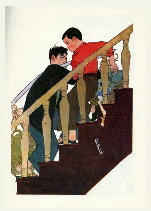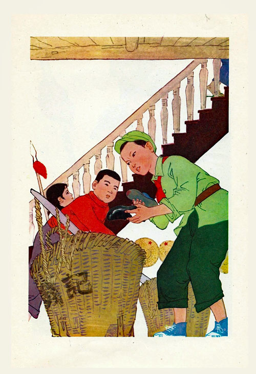24 D’un air fâché, Tche-hai apostrophe l’inconnu. Celui-ci se met à ramasser ses marchandises. En arrivant en bas, il voit que deux des enfants seulement sont là, rassuré, il monte alors tranquillement en laissant ses corbeilles. Siao-po profite de son absence pour les fouiller et y trouve trois souliers usés de caoutchouc qu’il va remettre immédiatement à l’Oncle Li dans la pièce voisine.