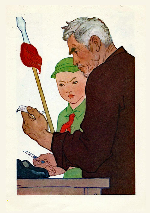 21 Quelques jours après, dans l’après-midi, un inconnu vient dans le village acheter des objets de rebut. Il fait la tournée du pays, puis s’arrête devant la maison de l’ancien despote. L’inconnu, après avoir échangé discrètement des mots de code avec la vieille femme, lui achète un soulier de caoutchouc. Mais toute la scène a été observée par de Petits Gardes rouges qui ont reçu l’ordre de la cellule du Parti de se poster derrière des arbrisseaux.