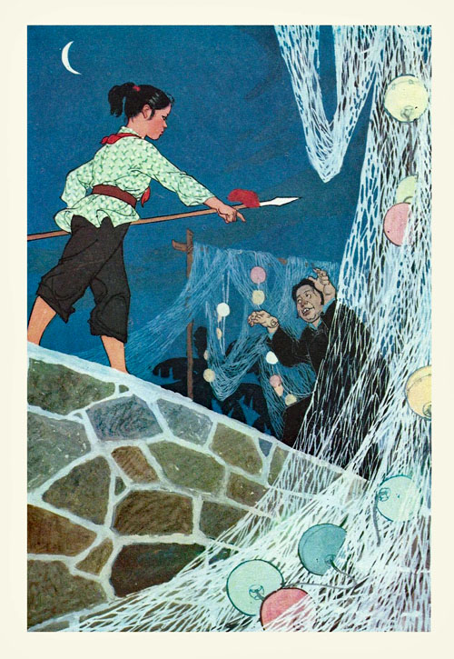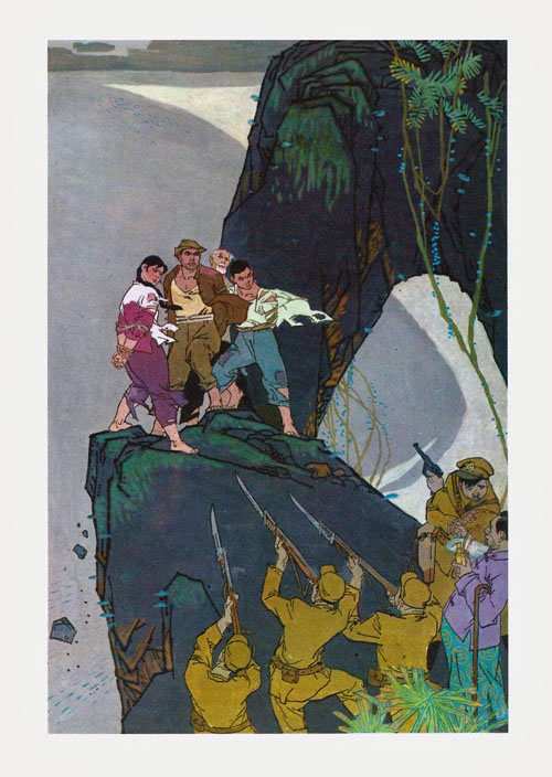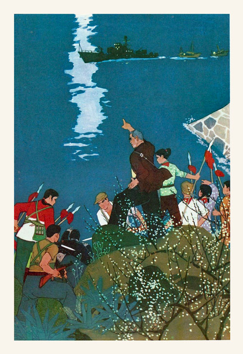 34 A ce moment, sur la mer se fait entendre un grondement de moteur. C’est une canonnière de l’Armée populaire de Libération qui vient vers la côte, remorquant le bateau espion camouflé en bateau de pêche. Oncle Li déclare alors aux deux ennemis : « Votre ‘bateau de pêche’ vient vous ‘rejoindre’ ! » Les deux traîtres baissent la tête, tremblant de peur.