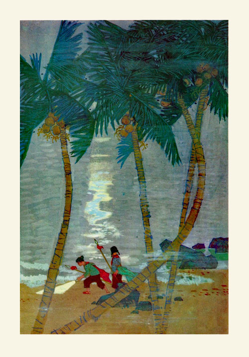 20 Hai-houa ramasse le soulier et court avec Tsouei-kiuan au village pour faire son rapport à Oncle Li Tchen. Après avoir examiné le soulier, ce dernier dit aux enfants : « Selon les informations données par un villageois, hier soir une femme est allée vers la plage. D’après le signalement, c’est sans doute l’épouse du despote. Il est fort possible que ce soit elle qui y ait laissé ce soulier. Nous devons bien la surveiller. »