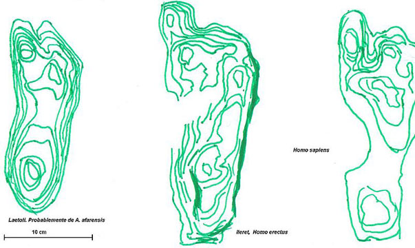 Comparaison d’empreintes de pas de l’Australopithèque (3,7 millions d’années), de l’Homo ergaster (1,5 million d’années), de l’Homo sapiens