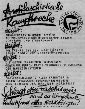 « L’Action antifasciste ne permettra pas que soit établie sur l’Allemagne la dictature fasciste, que les les organisations de classe du prolétariat soient détruites et interdites, que tous les droits de la classe ouvrière soient piétinés, que la sécurité sociale et toutes les réalisations du mouvement ouvrier soient éradiquées.