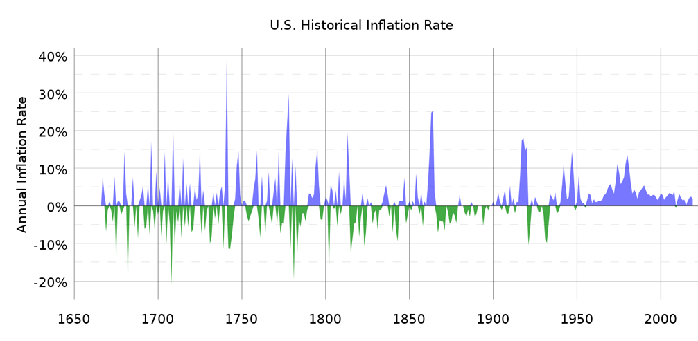 Voici un graphique présentant l’inflation aux États-Unis. Avant 1914, l’inflation était en rapport direct avec les cycles capitalistes et apparaissait massivement de manière épisodique. Avec la première crise générale du capitalisme, l’inflation s’installe par contre.