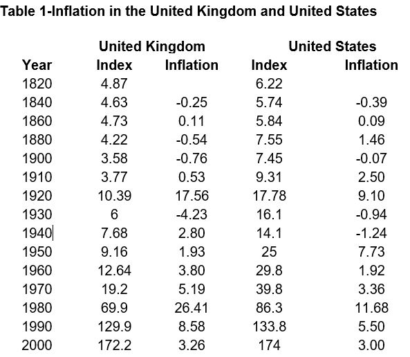 Le tableau suivant présente l’inflation au Royaume-Uni et aux États-Unis, pour les 19e et 20e siècles. On voit très clairement comment le capitalisme se développe au 19e siècle sans inflation, et au 20e siècle avec elle.