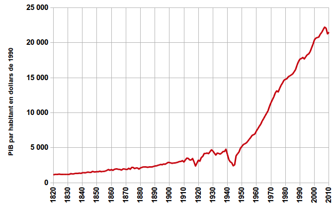 Et il est une chose qu’on remarque tout de suite. L’inflation qui se systématise va de pair avec l’expansion massive des forces productives. Voici le PIB français. Quand on sait que l’inflation s’installe systématiquement au 20e siècle, notamment à partir de 1945, alors le rapport est évident.