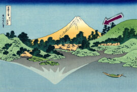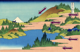 La 34e estampe des Trente-six vues du mont Fuji, intitulé Le lac d’Hakone dans la province de Sagami, est indéniablement l’oeuvre la plus minimaliste de la série. Il s’agit en quelque sorte d’un exercice de style. Il y a une dimension naïve assumée.