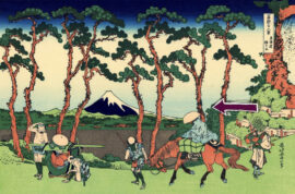 Hodogaya sur le Tōkaidō clôt normalement les Trente-six vues du mont Fuji, avant que l’éditeur ne rajoute par la suite une série de dix estampes. C’est en quelque sorte un résumé des estampes précédentes, dont divers éléments sont ici rassemblés, afin de marquer les esprits. Si les couleurs rendent bien, la démarche reste toutefois assez élémentaire, malgré la dimension typique montrée, le statut des serviteurs n’étant guère à envier.
