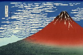 On remarquera d’ailleurs que dans la première estampe, il y a une continuité complète dans le dessin de la montagne, les nuages évoluant à l’arrière-plan pour en souligner cette majesté. Dans la seconde, le mont Fuji se présenta avec un sommet difficilement inaccessible, pour ne pas dire inatteignable. Le ciel est d’ailleurs immaculé, le sommet du mont Fuji semblant relever de la même substance.