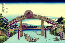 Le côté droit du pont est davantage marqué par les arbres allant vers le fond, à l’opposé du côté gauche où la végétation semble plus proche. Il n’y a droite qu’un pecheur isolé, alors qu’au centre, tourné vers la gauche, il y a un pêcheur sur un navire (l’image se lit de droite à gauche au Japon). Le mont Fuji apparaît davantage du côté gauche, comme la personne avec l’ombrelle sur le pont.