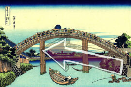Pourquoi cela ? Parce que le pont est un lieu de passage, qu’il abrite d’ailleurs des vendeurs de poissons et de tortues (parfois justement achetés et relâchés dans l’esprit bouddhiste) ; il est un lieu populaire du Japon, dont on a ici une image vivante.
