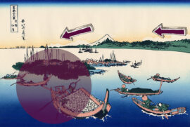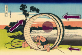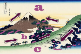 Cette activité typique joue en fait en s’appuyant sur le cercle élaboré, par un jeu de poids et de contre-poids, le mont Fuji en décalage servant de développement inégal pour renforcer l’idée de mouvement déjà présente par la perspective légèrement décalée.