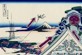La onzième estampe, Le temple d’Asakusa Honganji à Edo, est bien plus marquante. La partir visible du temple bouddhiste témoigne d’une activité laborieuse en hauteur, qui a trois parallèles: le cerf-volant partant de la ville, une construction en cours et le mont Fuji.