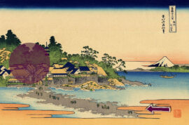 La 27e estampe des Trente-six vues du mont Fuji, intitulée Enoshima dans la province de Sagami, nous montre l’accès à cette île très touristique de quatre kilomètres de circonférence. Le mont Fuji est sur la droite, juste derrière le navire.