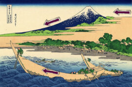 On retrouve ici la simplicité, par le mouvement directionnel et le contre-poids, le mont Fuji servant pour la profondeur, la mise en perspective.