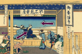 Yoshida dans la région de Tōkaidō, avec son gros plan, change entièrement de mise en perspective. Cette 29e estampe accorde une place éminente à des femmes, ainsi qu’au décor de l’endroit. C’est une scène avec une dimension intimiste, appuyée par conséquents par de multiples éléments graphiques. Ce qu’on lit sur la bannière horizontale signifie littéralement la maison de thé avec vue du mont Fuji (Fujimi chaya). Il s’agit là d’une station sur la route d’Edo à Kyoto (ou inversement), dite route de Tokaido.