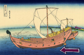 On notera que le mouvement de l’océan tranche avec la dimension statique du mont Fuji : pour ce dernier le mouvement accordé à l’image provient de sa forme, tandis que pour les navires il n’y a pas que la forme, il y a les marins et l’océan.