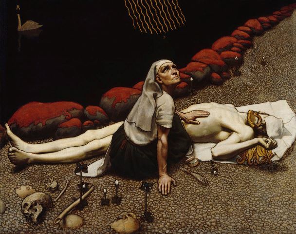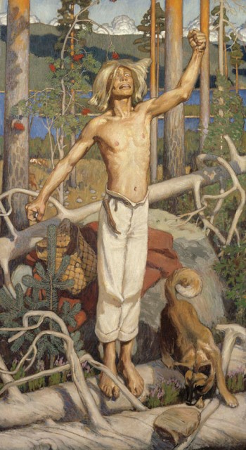 Akseli Gallen-Kallela (1865-1931) est ainsi un peintre finlandais réaliste passé dans le camp de l’art nouveau, façonnant une forme artistique ouvertement en soutien au régime ultra-conservateur et contre-révolutionnaire né en 1918.