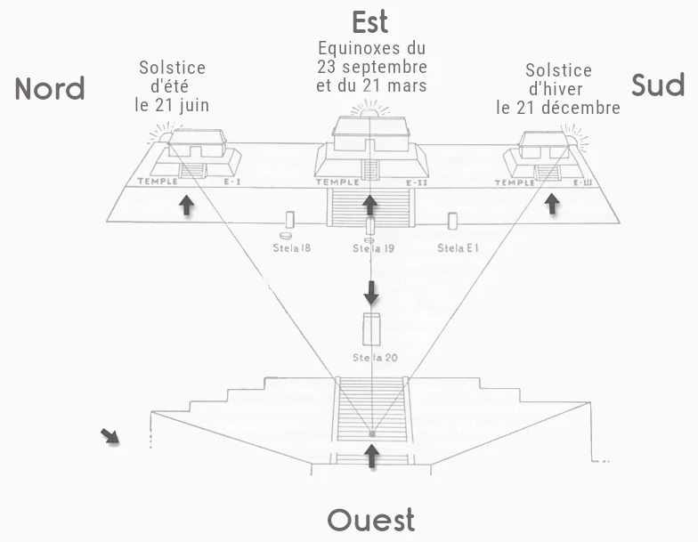 Notons également le site maya d’Uaxactun, dont le nom original était Siaan K’aa (« né dans le Ciel »), qui est ici une petite merveille de construction dans son rapport aux solstices et aux équinoxes. La pyramide fait face à trois temples et depuis celle-ci, on peut voir une partie du soleil à gauche du premier temple lors du solstice d’été, une partie du soleil à droite du troisième temple pour le solstice d’hiver et une partie du soleil au-dessus du temple du milieu lors des équinoxes.