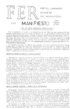 C’est le résultat que Mariátegui a trouvé de l’application du marxisme-léninisme aux conditions concrètes du pays et de l’Amérique latine ; c’est la CHEMIN DE MARIÁTEGUI DONT LA VALIDITÉ EST PLEINEMENT EN VIGUEUR, AUQUEL ONT FERMEMENT ADHÉRÉ LES RÉVOLUTIONNAIRES PÉRUVIENS , ET PLUS ENCORE LES RÉVOLUTIONNAIRES PÉRUVIENS QUI LUTTENT SOUS LES DRAPEAU DU MARXISME-LÉNINISME PENSÉE MAO ZEDONG. »