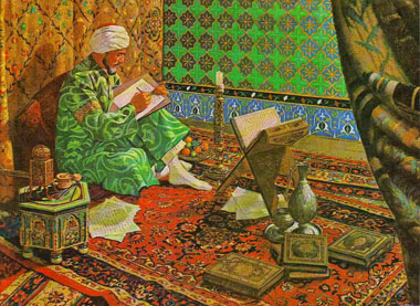 Aujourd’hui en Europe, on connaît plus le poète, mathématicien et astronome persan Omar Khayyam, très largement célébré en Angleterre (par les préraphaélites à la fin du 19ème siècle [et à l’origine des images dans cet article]).