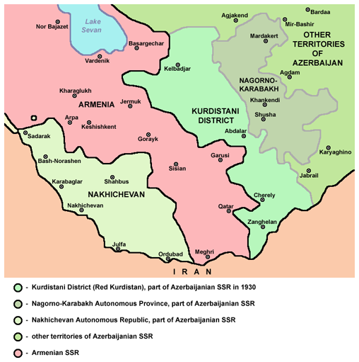 À l’ouest de ce couloir, on a le Zanguezour (du nom du massif montagneux), qui lui fut intégrée à l’Arménie sous le nom de Syunik. La région à l’ouest de Syunik, le Nakhitchevan, une région peuplée très majoritairement d’Azéris, fut par contre rattachée à l’Azerbaïdjan, mais en tant que République Socialiste Soviétique autonome.
