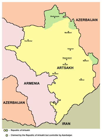 Le nom d’Artsakh est en effet à la base celui d’une province de la « grande Arménie » de la géographie traditionnelle. L’espace ainsi désigné, majoritairement arménien mais non exclusivement va à la fin de l’époque médiévale être soumis à différentes puissances (ottomane, perse, russe). Cette province, grosso modo sur le territoire du Nagorny Karabagh, fut la dernière de la grande Arménie à être conquise.