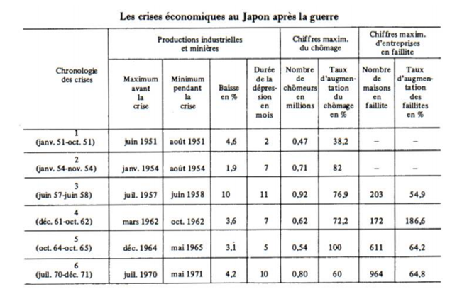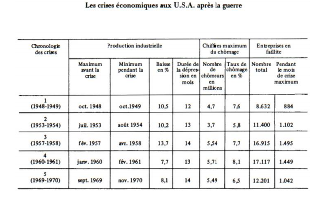 Premièrement, le cycle des crises se raccourcit. Les crises sont plus fréquentes. Avant la deuxième guerre mondiale, les crises économiques étaient espacées d’environ 10ans, et dans les 20 années consécutives à la guerre, le cycle des crises s’est manifestement raccourci. D’après les tableaux ci-dessous, on peut voir que de 1948 à 1972, les U.S.A. ont traversé cinq crises économiques, soit en moyenne une crise tous les cinq ans environ ; et le Japon a traversé six crises économiques, soit en moyenne une crise tous les quatre ans environ.