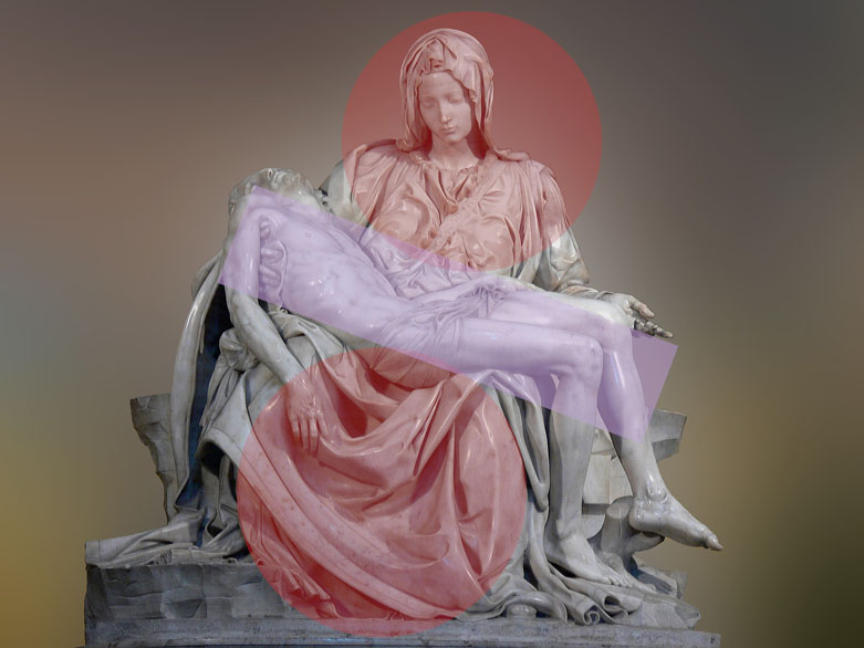 Une présentation en trois dimensions de l’oeuvre (réalisé pour wikipédia) souligne cette disproportion. La Vierge Marie est un bloc servant de support au Christ.