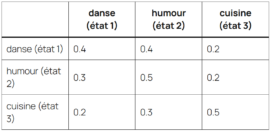 Les probabilités de transition indiquées dans le tableau sont les suivantes.