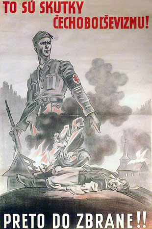Affiche du régime slovaque collaborateur contre le grand soulèvement national slovaque. « Tels sont les actes [anti-paysans et anti-religieux] du tchéco-bolchevisme ! » « Aux armes ! »