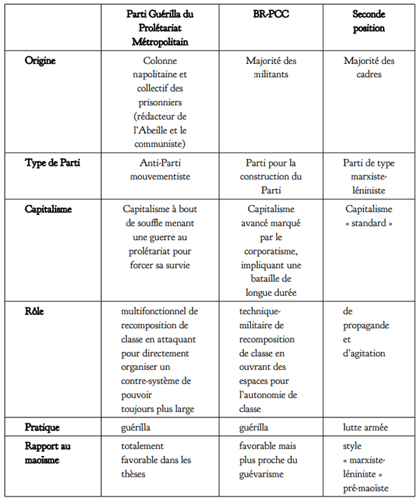 – une ligne d’ultra-gauche : le Parti Guérilla du Prolétariat Métropolitain pense que le capitalisme n’est plus que destruction et qu’on peut mettre de côté les ouvriers pour désormais s’appuyer également sur les marginaux, car le contexte est celui d’une guerre sociale totale ;