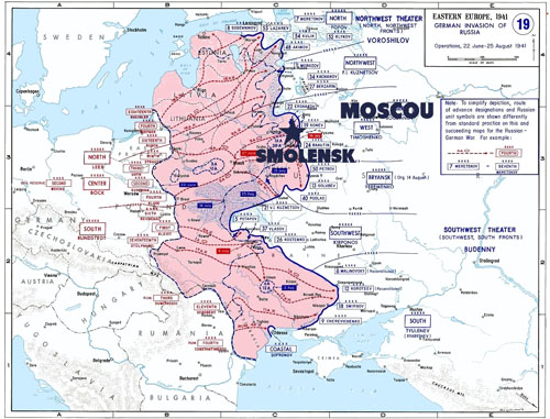 Ayant compris la nature du territoire soviétique et reprenant le principe de 1812, l’armée rouge fit tout pour faire s’enliser les armées nazies, ces dernières cherchant inversement une bataille décisive. On a d’ailleurs dès le départ l’équivalent de la bataille de Borodino, succès aux yeux des Russes en 1812, grande victoire dite de la Moskowa pour Napoléon.