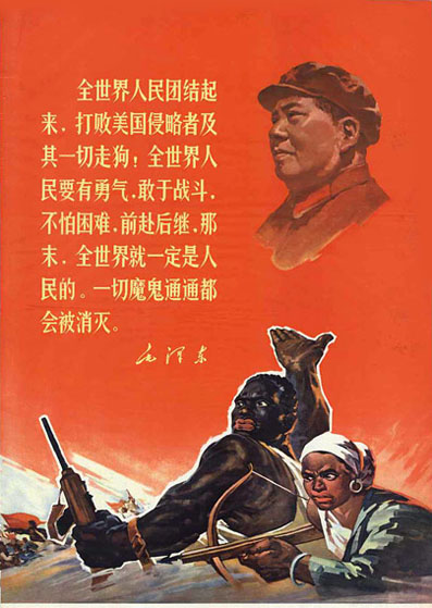 Peuples du Monde, triomphez des envahisseurs américains et de tous ses laquais! Les peuples du monde ont à avoir du courage, à être brave dans la bataille, n’ayez pas peur des difficultés et avancez vague par vague, alors le monde sera définitivement celui du peuple. Les démons seront tous anéantis. Mao Zedong